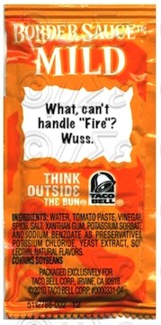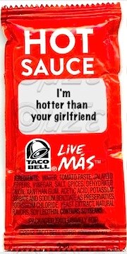 Today, as I practice my “Taco Bell Tuesday” tradition of enjoying a sumptuous repast of pre-seasoned, pre-cooked “Mexican-like” food in the “luxurious dining room” of my local Taco Bell, I noticed the cute sayings on their sauce packets and wondered about possible sayings their Advertising Department rejected. (Click an image to enlarge)