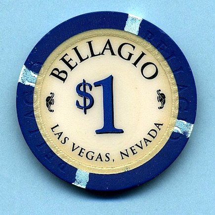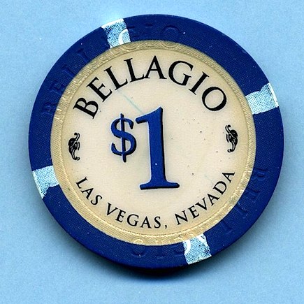 $1.00 Bellagio, Las Vegas NV First Issue, Obsolete, Paulson house mold chip. Light blue insert at each cardinal point, large white inlay shows very slight yellowing due to age. Front has blue mark from another chip. Slightly Used (SU) condition. Asking $4.50 --