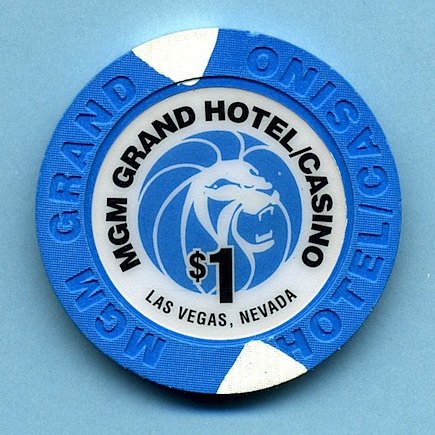 $1.00 MGM Grand Hotel/Casino, Las Vegas NV Blue Paulson house mold chip has two opposing white triangular inserts. Inlay displays MGM's iconic "Leo the Lion" surrounded by "MGM Grand Hotel/Casino" in concentric rings. Issued in 1996 after MGM closed their theme park. Slightly Used (SU) condition. Asking $3.00 --