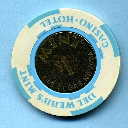 $1.00 Mint Hotel and Casino, Las Vegas NV Obsolete vintage chip has brass metal inlay with "Mint Las Vegas, Nevada" about it's perimeter. Distinctive light blue Bud Jones rim design include diamond shaped insert at cardinal points of edge. Slightly Used (SU) condition, but has corrosion damage (D) on the reverse side. Asking $35.00 --