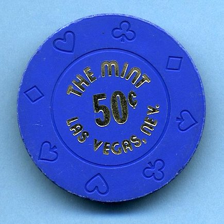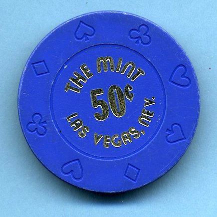 50-Cent Mint Hotel and Casino, Las Vegas NV Blue fractional chip has Bud Jones "embossed suits" mold; inlay hot stamped with "50¢" encircled by "The Mint Las Vegas, Nev". Corners of edge shows slight wear, but still looks... Slightly Used (SU) condition. Asking $15.00 --
