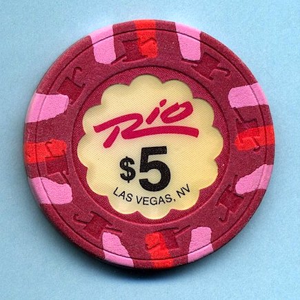 $5.00 Rio Hotel and Casino, Las Vegas NV Paulson "Short Cane" mold chip has pink, red, pink inserts at the cardinal points. Scalloped inlay shows "Rio" logo. Dates from the mid 1990's. Appears overwashed, so I'm rating it... Average (AV) condition. Asking $8.50 --