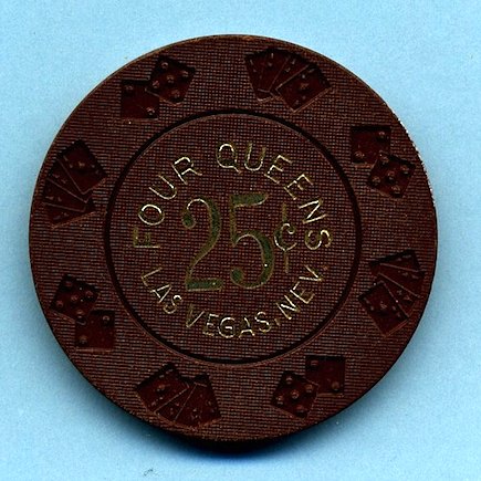 25-Cent 4 Queens, Las Vegas NV Brown DIECAR (dice and cards) mold fractional chip; inlay hot stamped with "25¢" encircled by "Four Queens Las Vegas Nev". Slightly Used (SU) condition. Asking $3.50 --