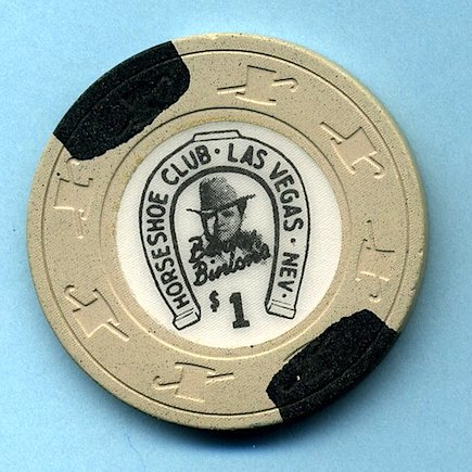$1.00 Horseshoe Club, Las Vegas NV Paulson "Short Cane" mold; beige colored chip with two opposing black inserts. White inlay shows (murder victim) Benny Binion's face surrounded by "lucky" horseshoe having "Horseshoe Club, Las Vegas Nev." written inside. Design is from the 1950's, this chip dates from the early 1980's. Front has very small round nick left of Binion's face. Slightly Used (SU) condition. Asking $7.00 --