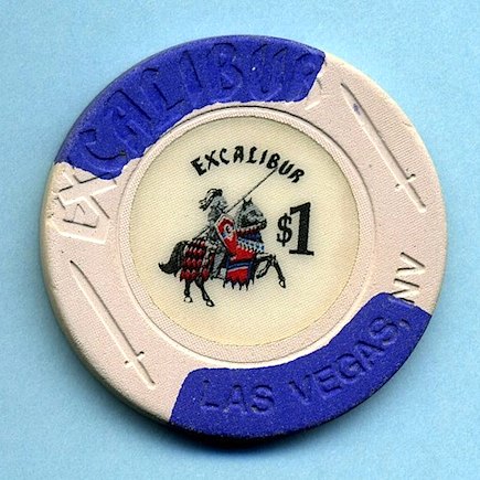 $1.00 Excalibur Hotel and Casino, Las Vegas NV Insert of white chip with two opposing blue inserts shows knight holding his shield and raised lance on a prancing horse. Average (AV) condition. Asking $4.50 --